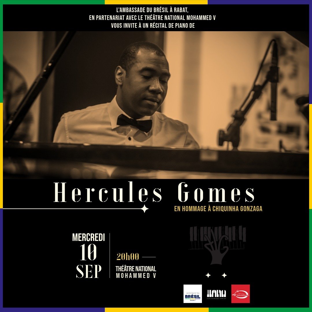 L’Ambassade du Brésil à Rabat et le Théâtre National Mohammed V ont le plaisir de vous inviter à un récital exceptionnel du pianiste brésilien Hercules Gomes, figure majeure de la scène musicale actuelle, le mercredi 10 septembre 2025 à 20h00, à Rabat.